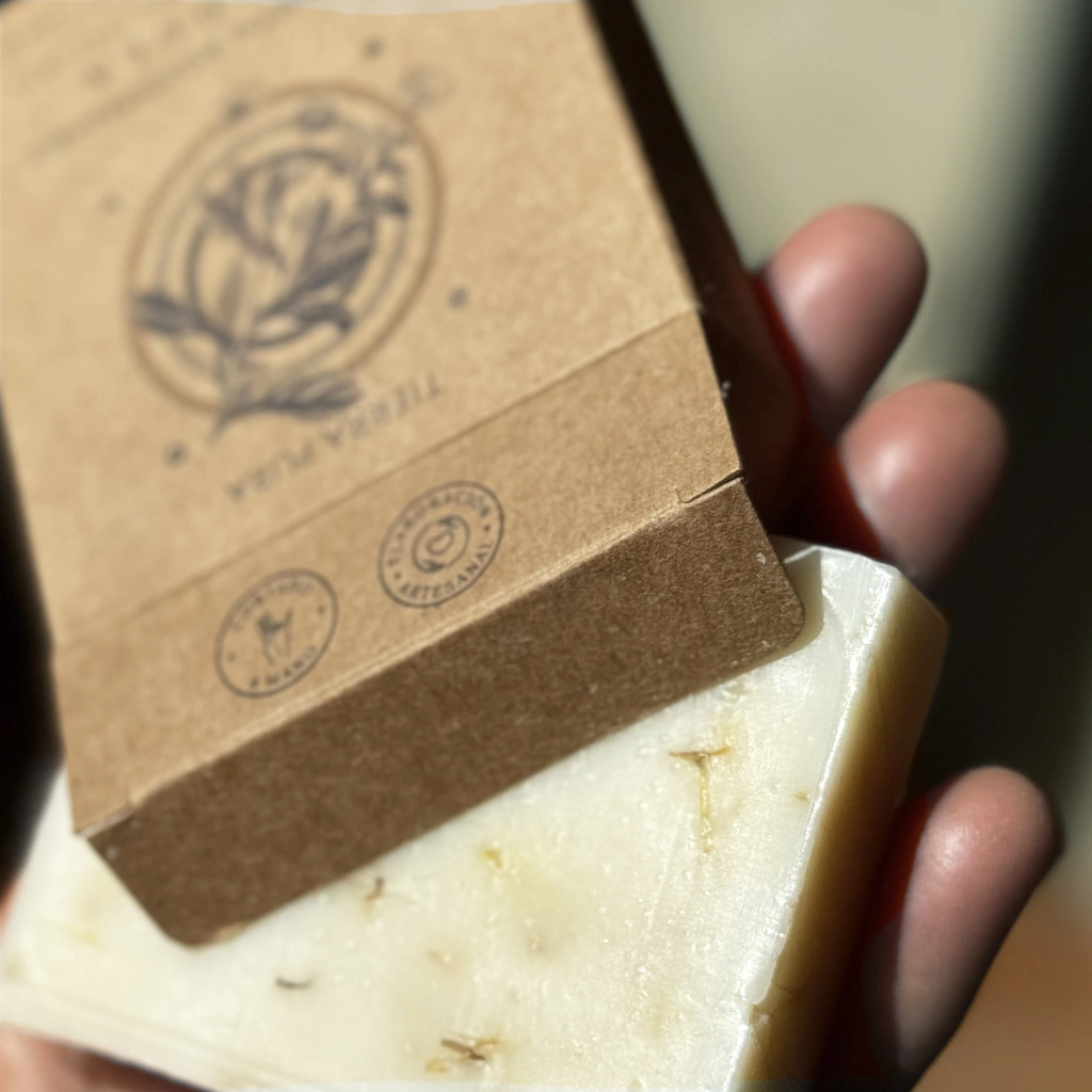 Jabón con aceite de Coco y pétalos de Caléndula macerados en aceite de Oliva orgánico. Sin perfumes.